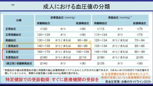 血管の状態を知る最も身近な方法が血圧測定です。2025年8月に改定された「高血圧管理・治療ガイドライン」では、すべての患者において、診察時血圧を130/80mmHg未満に保つことが治療目標とされています。一方、特定健診では、血圧が160/100mmHg以上の場合、「すぐに医療機関を受診すること」が求められています。これは、脳や心臓の病気につながるリスクが高い状態を見逃さないための目安です。なお、最近の報道では、「高血圧の基準が引き上げられた」といった誤解を招く表現も見られましたが、高血圧の診断基準そのものが変更されたわけではありません。現在も、高血圧の基準は140/90mmHg以上とされています。この段階では、まず生活習慣の改善に取り組み、それでも改善がみられない場合に医療機関の受診を検討することが勧められています。160/100mmHgは高血圧の新たな基準ではなく、「早めの受診が必要な目安」である点を正しく理解することが重要です。